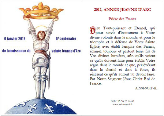 «...Et pour conduire le Prince à Reims, où Jésus-Christ étant déclaré suprême roi de France, Charles recevrait en son lieu et place la consécration et les insignes de la royauté...» (décret pontifical concernant l’Introduction de la cause en béatification de Jehanne d’Arc, heureusement cité par M. l’abbé Rioult p. 619).