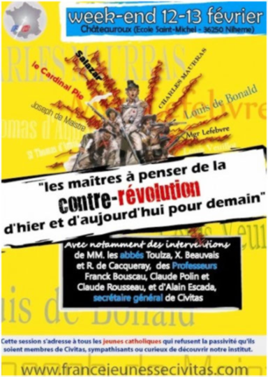 Louis de Bonald, Joseph de Maistre, Charles Maurras, le Cardinal Pie, Salazar, Louis Veuillot, mais aussi St Thomas d'Aquin et Mgr Lefebvre,... Avec notamment des interventions de MM. les abbés Toulza, X. Beauvais et R. de Cacqueray, des Professeurs Franck Bouscau, Claude Polin et Claude Rousseau, et d'Alain Escada, secrétaire général de Civitas .